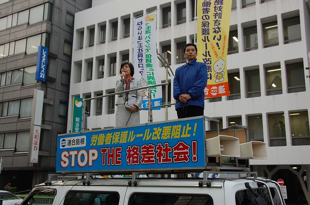 連合島根の皆さんとともに、ワークルール改悪反対の街宣活動を松江駅前で夕方行いました。