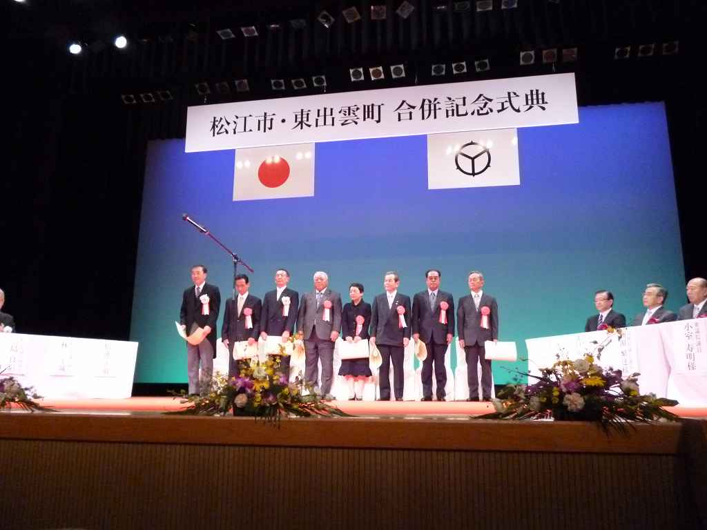 松江市と東出雲町が合併し、記念の式典が県民会館でありました。